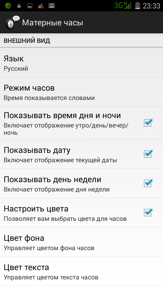 Новое приложение Матерные часы – это виджет, который предоставляет возможность отображать текущее время на экране Вашего андроид-устройства не только в цифровом, но и в текстовом формате — как в ругательной, так и в милой дружелюбной форме – всё зависит от Вашего настроения! А если у Вас установлен синтезатор речи (например, синтезатор от Гугл, доступный для большинства версий), то приложение ещё и озвучит написанное.