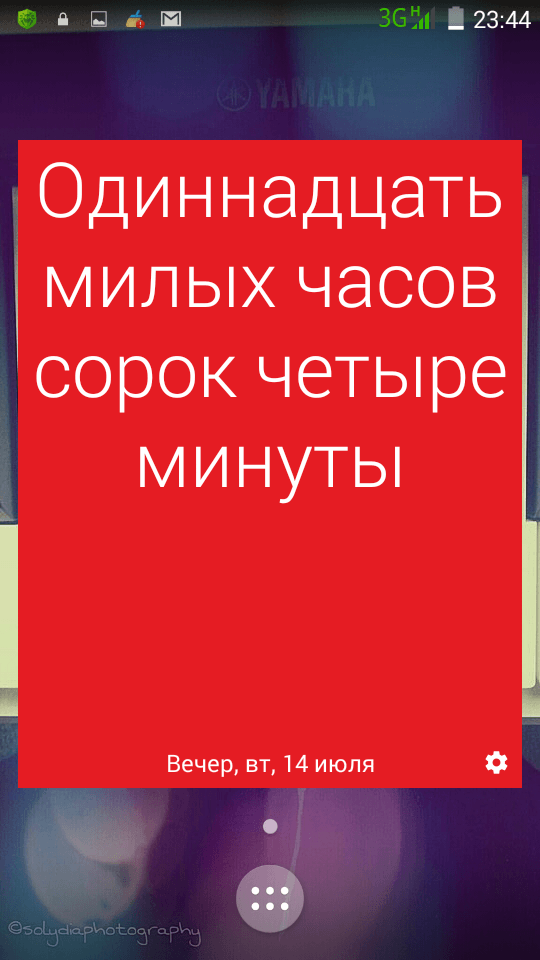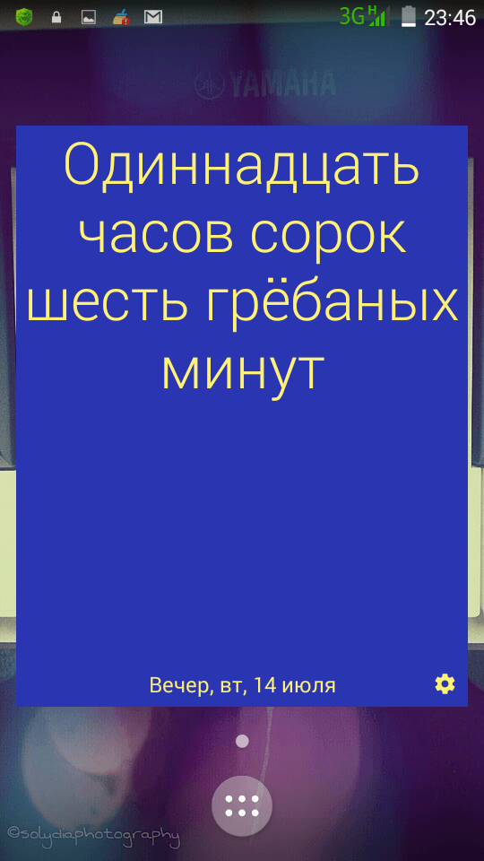Ругательство или радость легко переключить простым кликом по виджету. К примеру, кликнув на «Одиннадцать часов сорок шесть грёбаных минут» вы увидите уже доброе: «Одиннадцать милых часов сорок четыре минуты». Вместе со временем, на экране будет отображаться время суток, день недели и сегодняшняя дата.