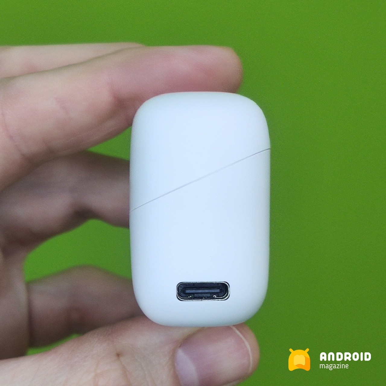 Кейс, несмотря на свои скромные габариты 55 х 41 х 25 мм, продуман до мелочей и выполнен с долей изящества — он отлично ложится в руку и удобно помещается в карман или сумочку. Минимализм в дизайне идет на пользу функциональности: наушники легко извлекаются и так же легко возвращаются на зарядку.