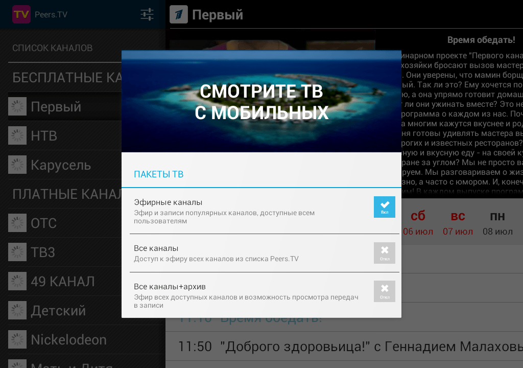 Peers.TV является уникальным приложением в своём роде. Всё дело в очень удобной функции — «Архив» . Благодаря этому новшество Вы в любой момент можете поставить на запись любимую телепрограмму и заниматься своими делами. А после без проблем можно просмотреть записанный материал.