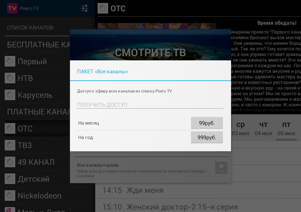 Команда создателей Peers.TV достигла договоренностей с каждым из каналов о легальной трансляции вещания: с кем-то удалось договориться о бесплатном сотрудничестве, но часть каналов предоставляет контент только за деньги. Поэтому в приложении появились платные подписки. Для пользователей приложения работа с каналами напрямую принесет лучшее качество, как говорится, из первых рук. Да и авторские права соблюдаются – плюсик в карму. Подписка на неделю стоит от 33р, что в 6 раз дешевле недельного проезда на транспорте или стандартного бизнес-ланча.