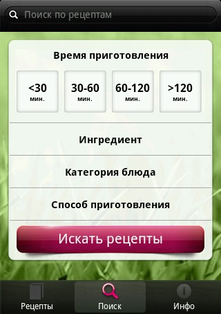 Так же хочу рассказать о функциях интеллектуального поиска блюда. Здесь сортировка по критериям играет огромную роль. Например, при вводе имеющихся у Вас продуктов, приложение само подбирает блюдо. Так же можно задать время приготовления.