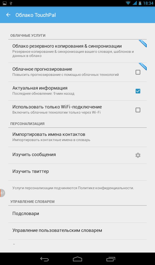 Очень хорошая клавиатура для андроид SwiftKey Keyboard. Основные опции, такие как возможность изменять тему оформления, редактирование вида клавиатуры и ввод текста росчерком уже включены в базовый функционал. Стоит уделить особое внимание на умение словаря запоминать новые слова автоматически (необходимо включить эту функцию в настройках). SwiftKey умеет работать с аккаунтами популярных соц. сетей. Это даст возможность пополнить словарь новыми словами, которыми вы часто пользуетесь.