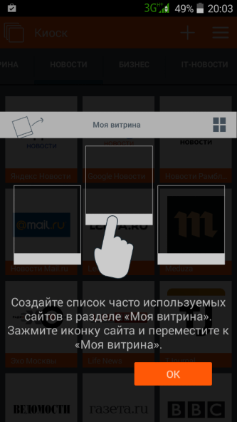 Самые популярные сайты уже встроены в приложение, но можно добавлять и свои. Также возможно выбрать для себя интересные и актуальные новостные сайты и создать список в разделе «Моя витрина», чтобы оперативно отслеживать свежую информацию.