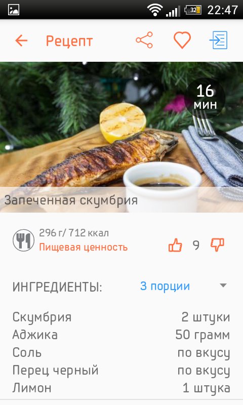 Для каждого блюда указаны его вес на выходе, время приготовления и калорийность. В самом рецепте указано точное количество нужных ингредиентов. Вы также можете выбрать количество порций, которое собираетесь приготовить, и программа пересчитает вес или количество продуктов, чтобы вам не приходилось тратить на это лишнее время.